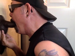 Gloryhole mature DILF teasing balls and blowing black cocks