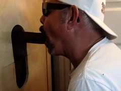 Gray DILF sucking and wanking gloryhole ebony cock in POV